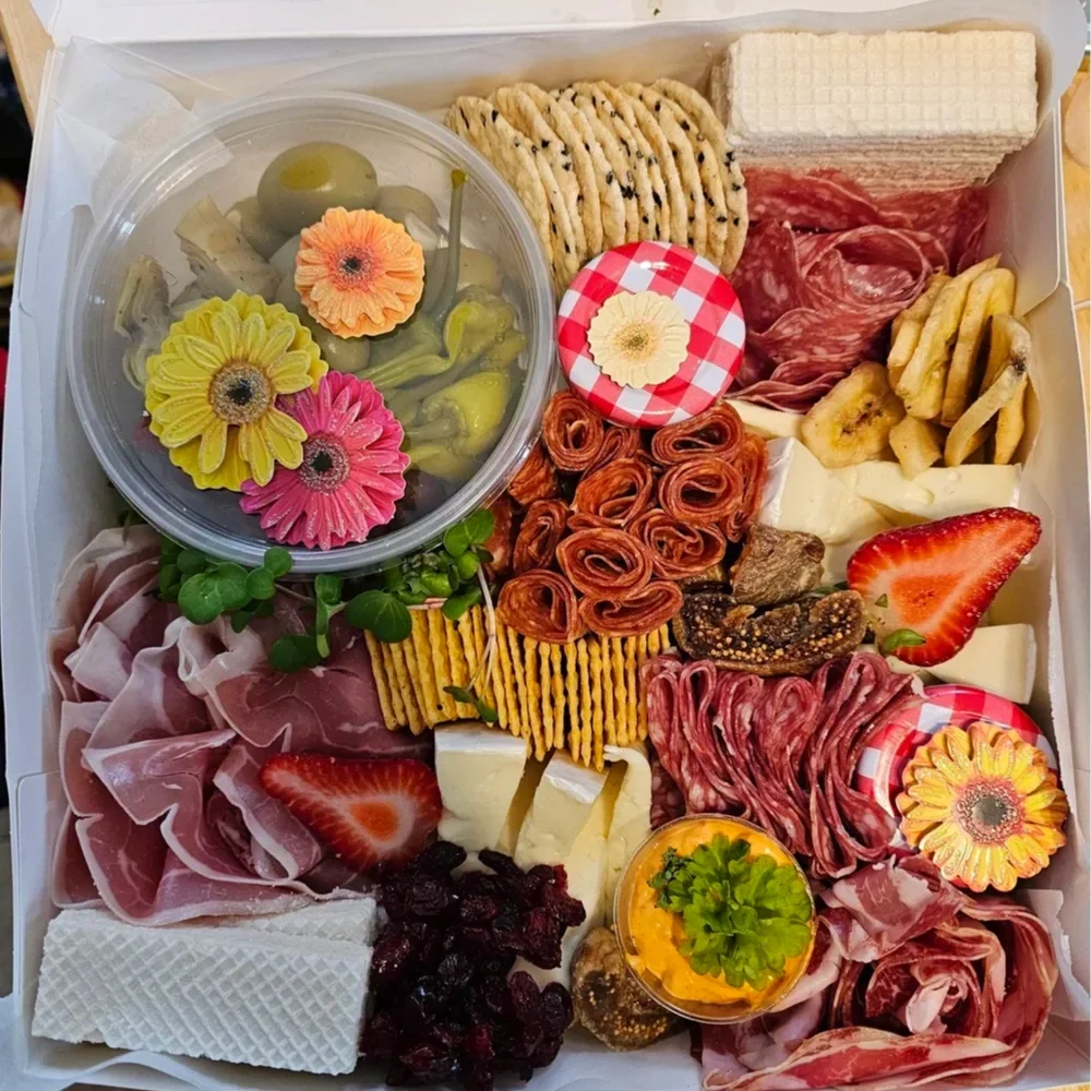 Medium (8x8) - "Shared Delight Box" for $85: Elevate your gatherings with our Shared Delight Box. This medium-sized treasure is ideal for sharing the joy of exquisite tastes. It's not just about the variety of sumptuous cheeses, premium meats, and fresh fruits, but also about the shared experience it brings. Perfect for a small group, it’s designed to create moments of togetherness, making any occasion special and memorable.